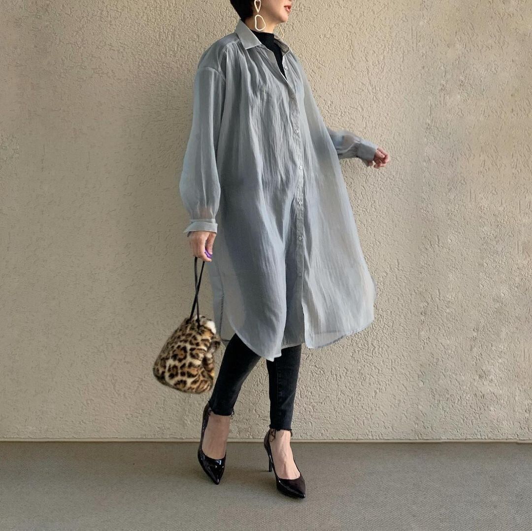 透けた素材でトレンド感はもちろんのこと、軽さが手に入る「シアーシャツワンピース」(1,990円)は、淡いトーンで合わせやすさ抜群!トレンチコートなどライトアウターのインナーとして重ね着すると今すぐ着用できます。スキニーデニムを合わせれば落ち着いた印象に。
