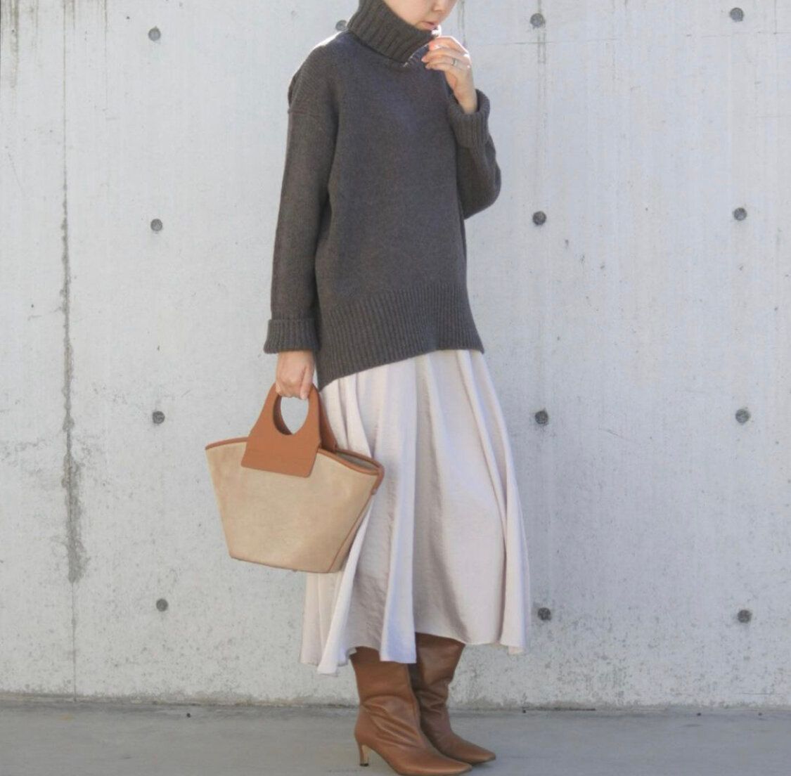 スカートに合わせるにもローゲージニットがおすすめ。ここでぴったりハイゲージタートルをもってくると一気にコンサバにみえて老け見え。