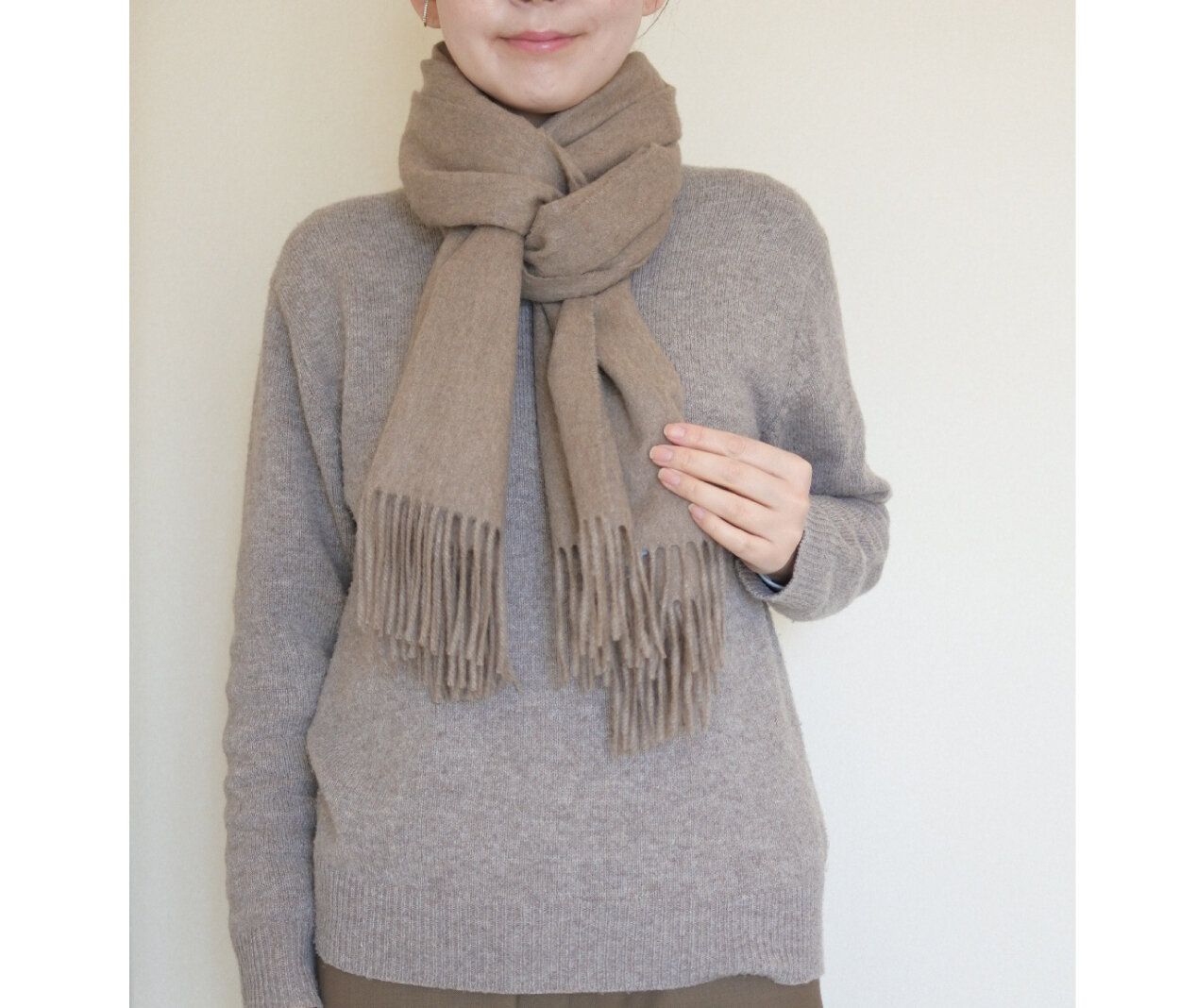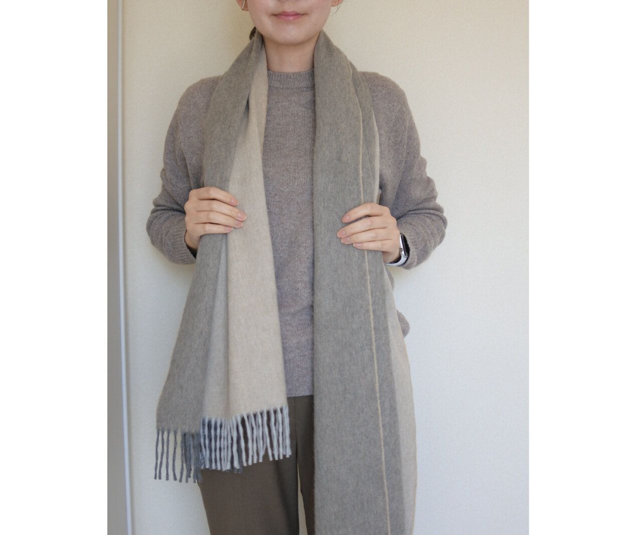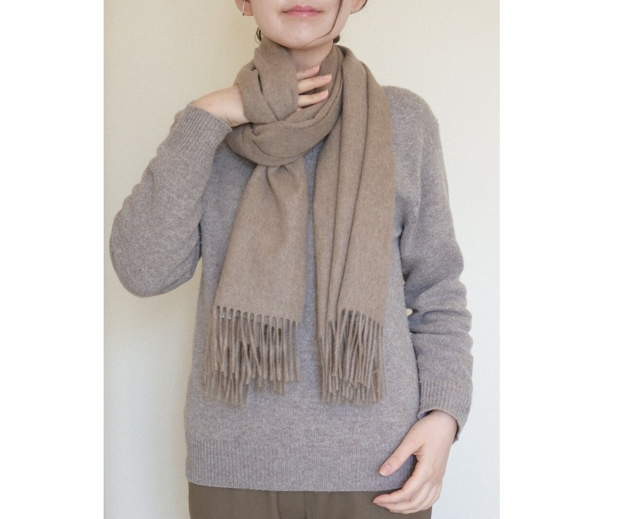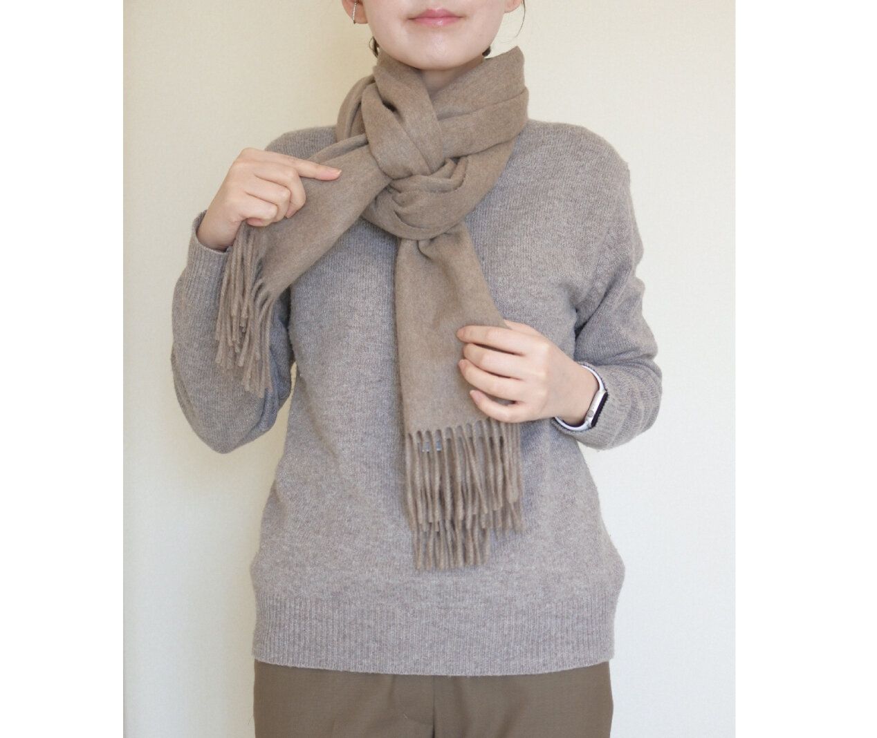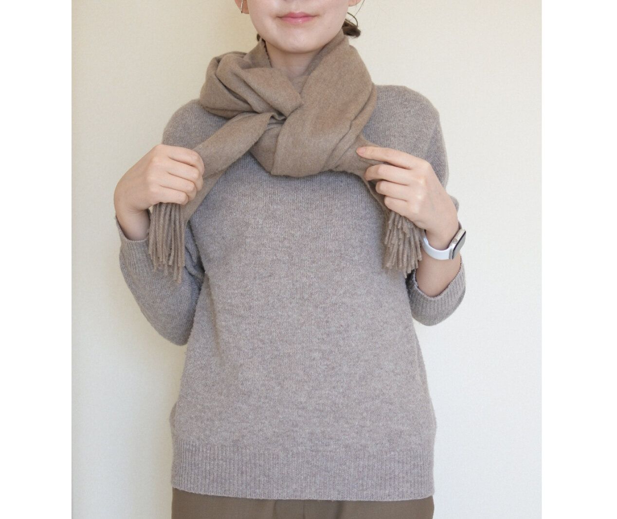 私がいちばん使う巻き方です。どんなコーデとも合わせやすく、前で2回クロスするのでしっかり暖かいです!