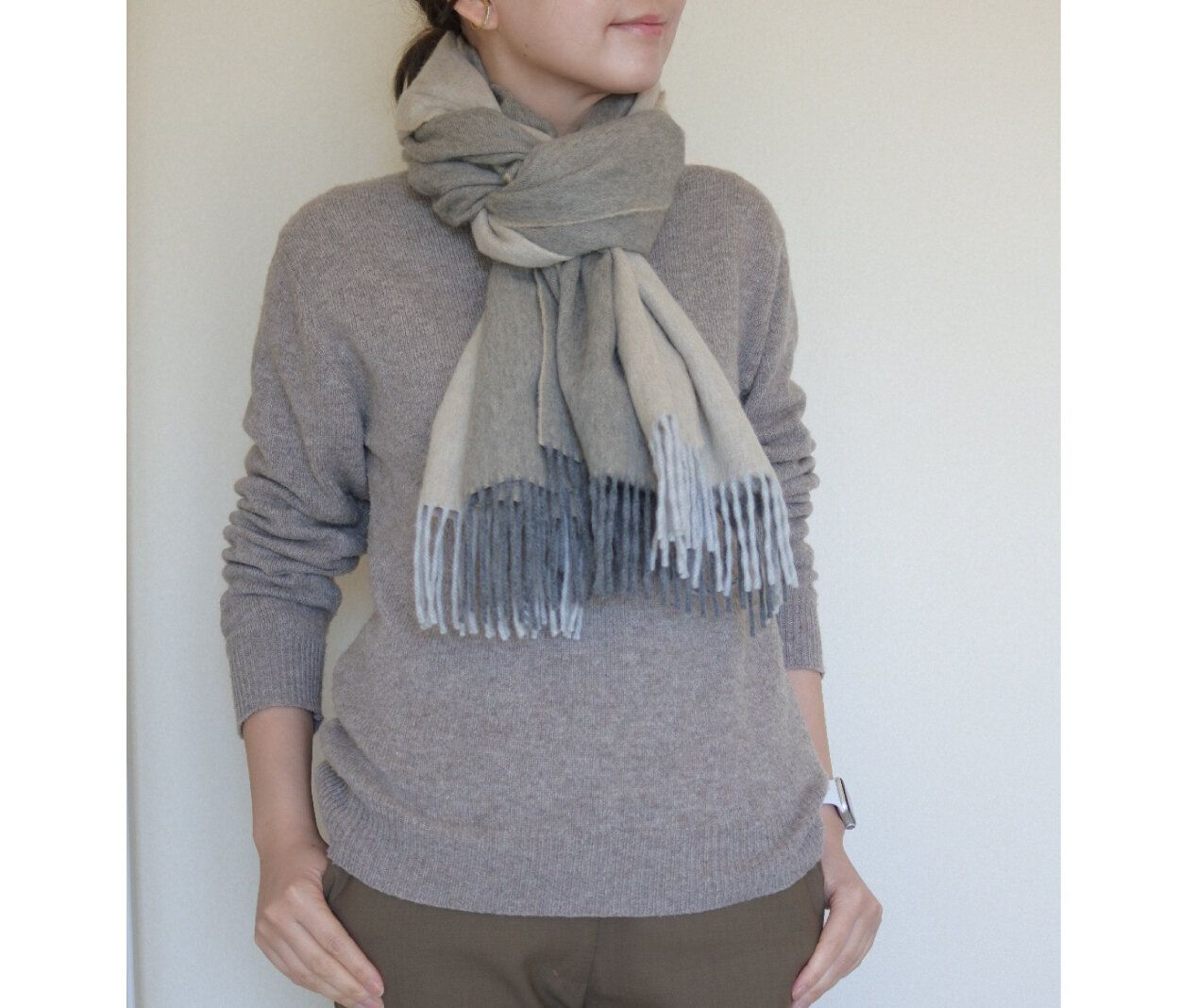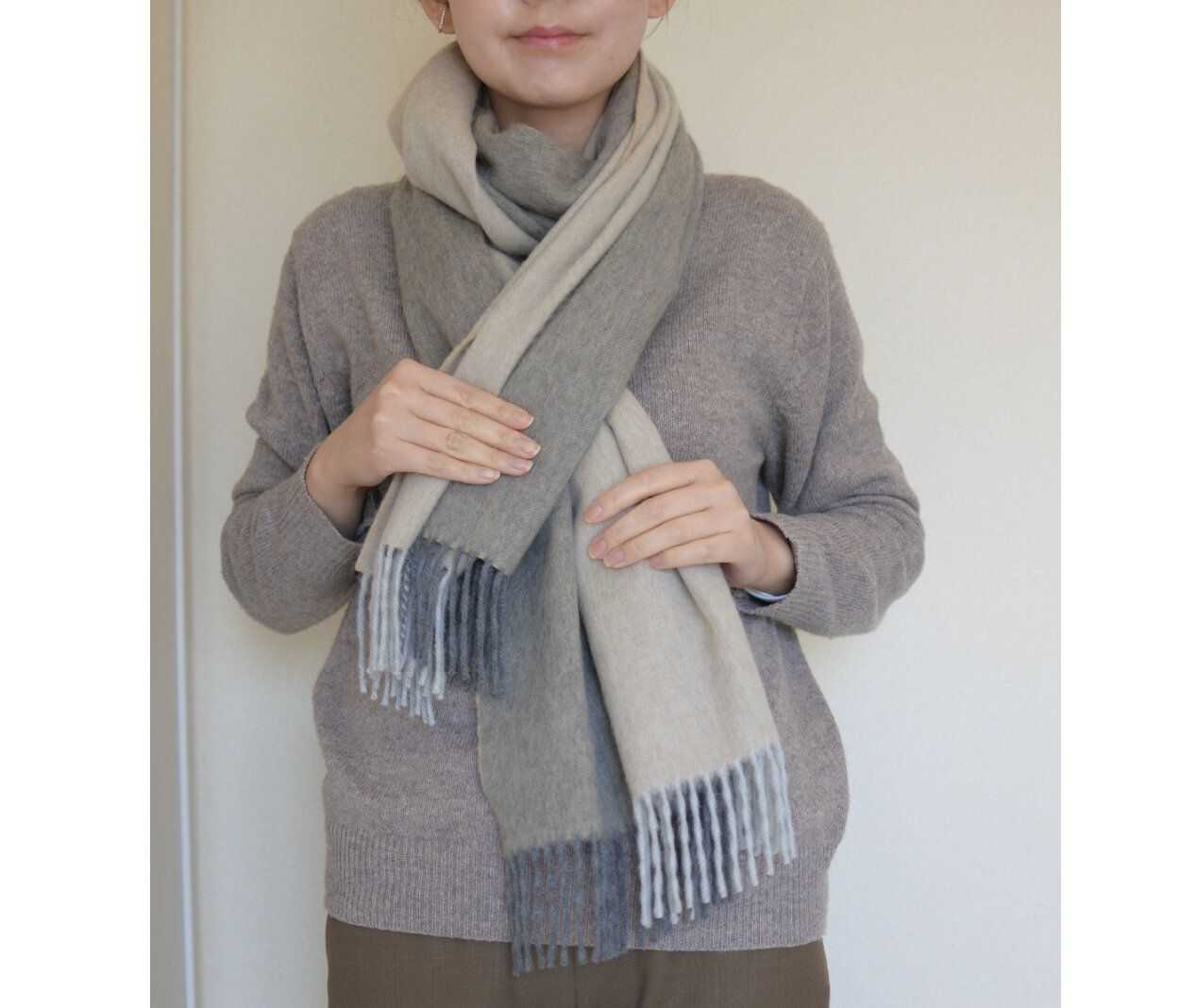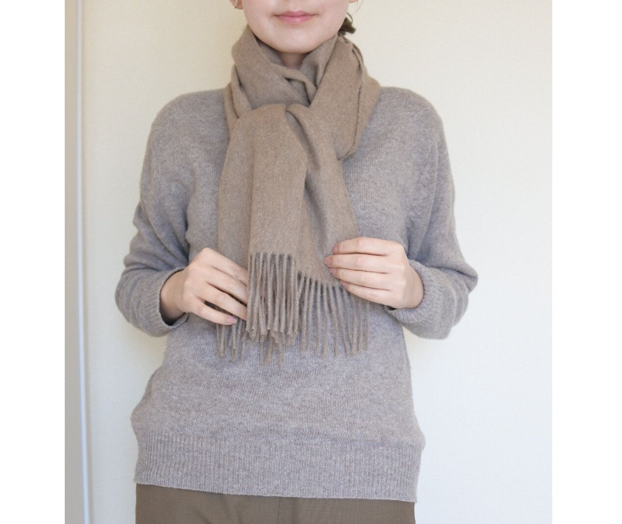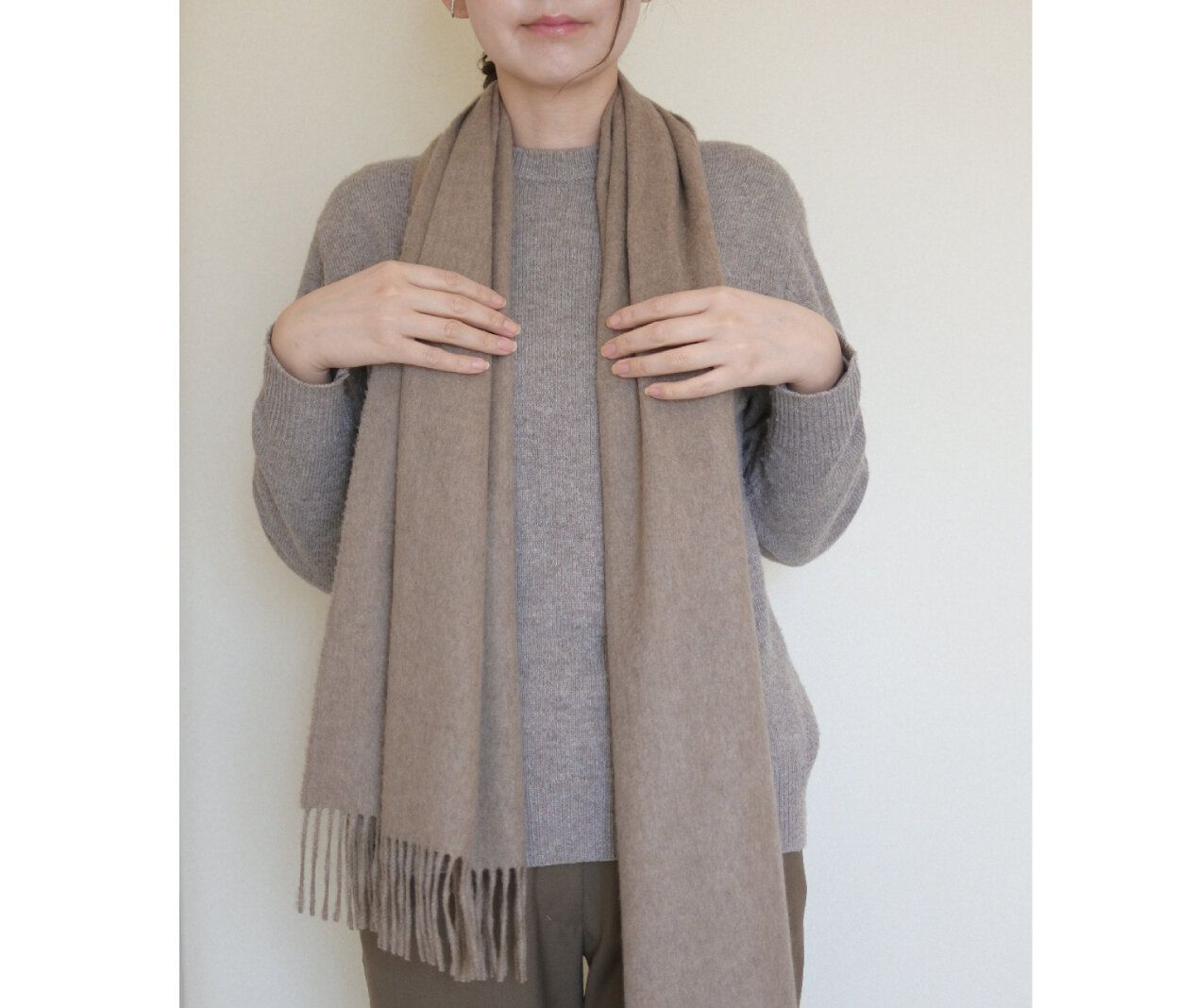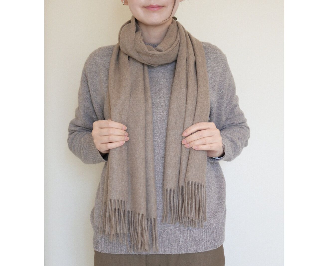 私がいちばん使う巻き方です。どんなコーデとも合わせやすく、前で2回クロスするのでしっかり暖かいです!