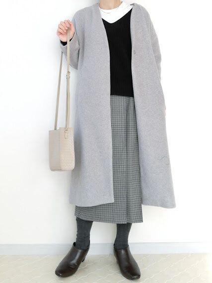 まだ寒い日は「ノーカラーコート」ですっきりシンプルに