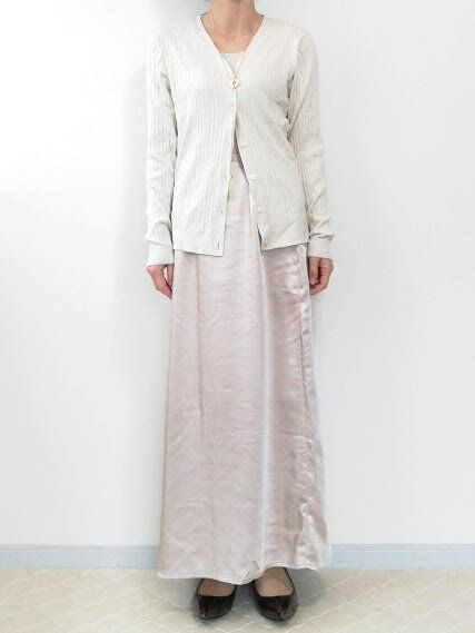 体に沿うコンパクトなVネックカーディガンは、どちらかと言えばコンサバなイメージ。艶やかなサテンスカートにきちんと着てしまうと、どこかあか抜けないちぐはぐな印象に…。