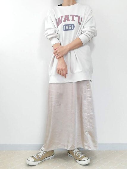 フェミニンなコーデが苦手なカジュアル派さんは、スウェット合わせがイチオシ。同系色のスウェットを合わせることで、まとまり感ある大人カジュアルな着こなしに。ロゴ入りのスウェットを選ぶと、よりカジュアルダウンできます。