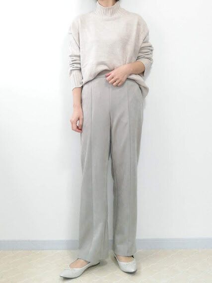 ホワイト寄りのライトグレーパンツにチェンジ。くすみがかったライトグレーは、優しく落ち着きあるイメージに見せてくれます。