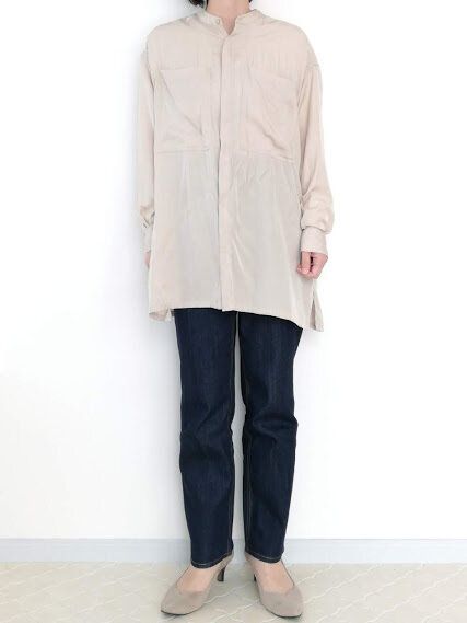 バンドカラーシャツは、特にチュニック丈のものがトレンドでよく見かけるアイテム。お尻が隠れる丈が40代にはうれしいのですが、デニム合わせの場合はそのまま着ると”もっさり”感が…。