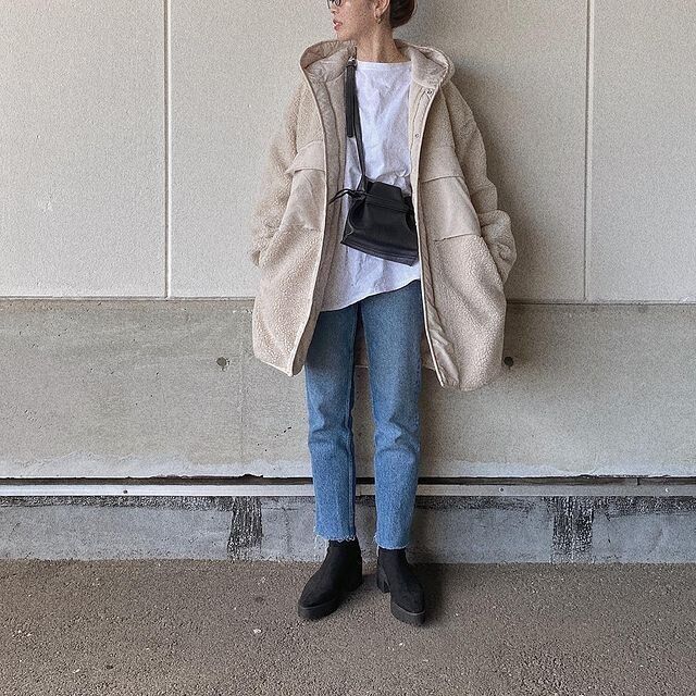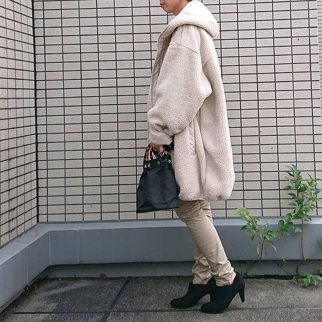 GUメンズの「ボアリバーシブルコートNT+E」を使ったコーデ。XLサイズのオーバーサイズ感が今っぽい!スキニーパンツですっきりとまとめて。バッグとブーティできれいめ要素をプラスすることで、大人女子らしい着こなしに。
