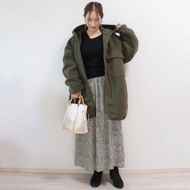 GUメンズの「ボアリバーシブルコートNT+E」を使ったコーデ。女らしいスカートスタイルを、オーバーサイズなボアアウターでカジュアルダウン。重くなりがちなダークカラーのアウターに、白のバッグで軽さをプラス。