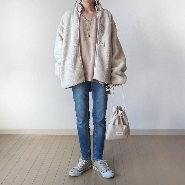 GUメンズの「シープボアフリースジャケット(長袖)」。ボアアウター×デニムのカジュアルコーデも、インのVネックニットで女らしい印象に。白・ベージュ・ブルーの柔らかい色みで合わせたやさしげな冬コーデ。