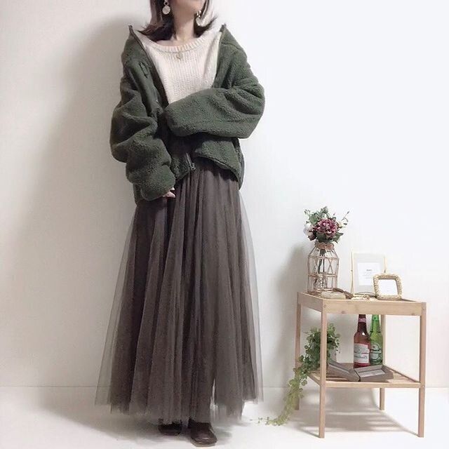 GUメンズの「シープボアフリースジャケット(長袖)」を使ったコーデ。ニット×チュールスカートのスイートな印象に、メンズアウターでほどよいカジュアル感をプラス。