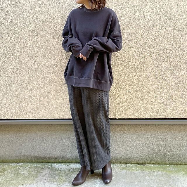 トップスとパンツがしまむら。ゆるスウェット×ケーブル編みニットパンツのトレンドコーデ。ダークグレーのワントーンで、カジュアルコーデを上品に。