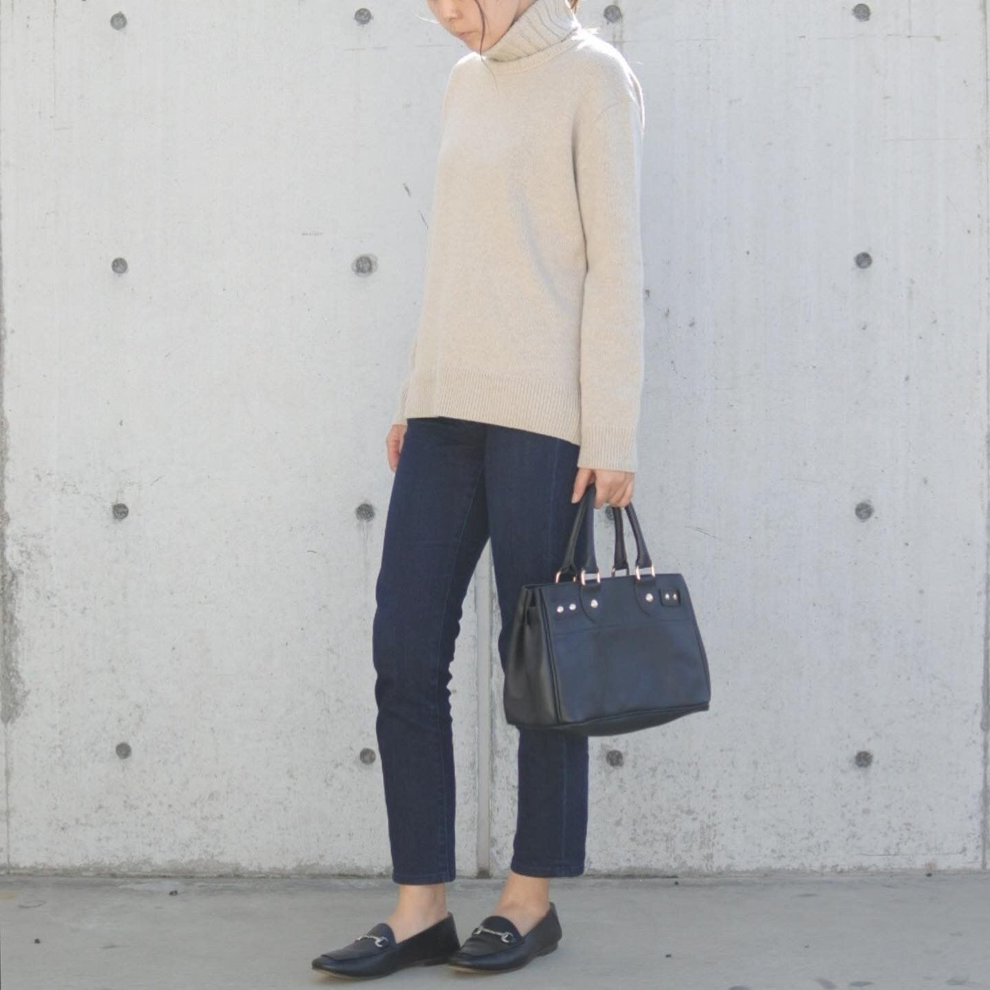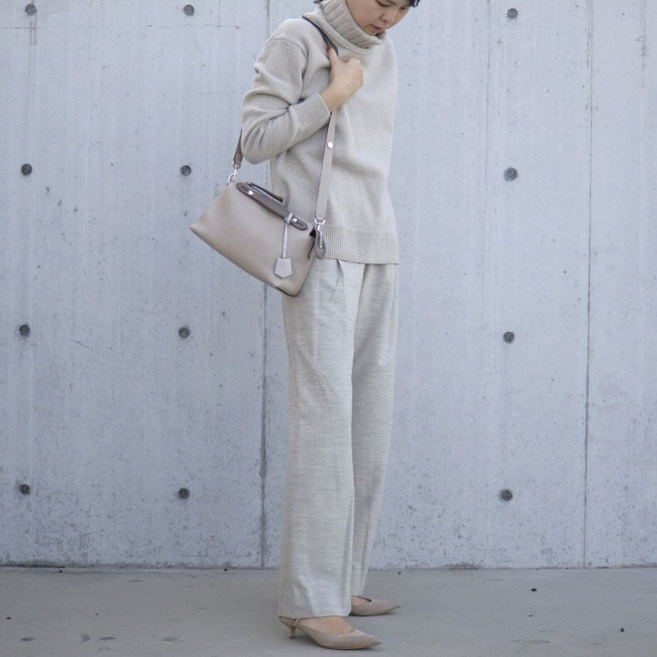 バッグは少し濃いベージュを取り入れました。バランスよく濃淡をつけると、ワントーンコーデでもメリハリがついておしゃれ度がアップします。