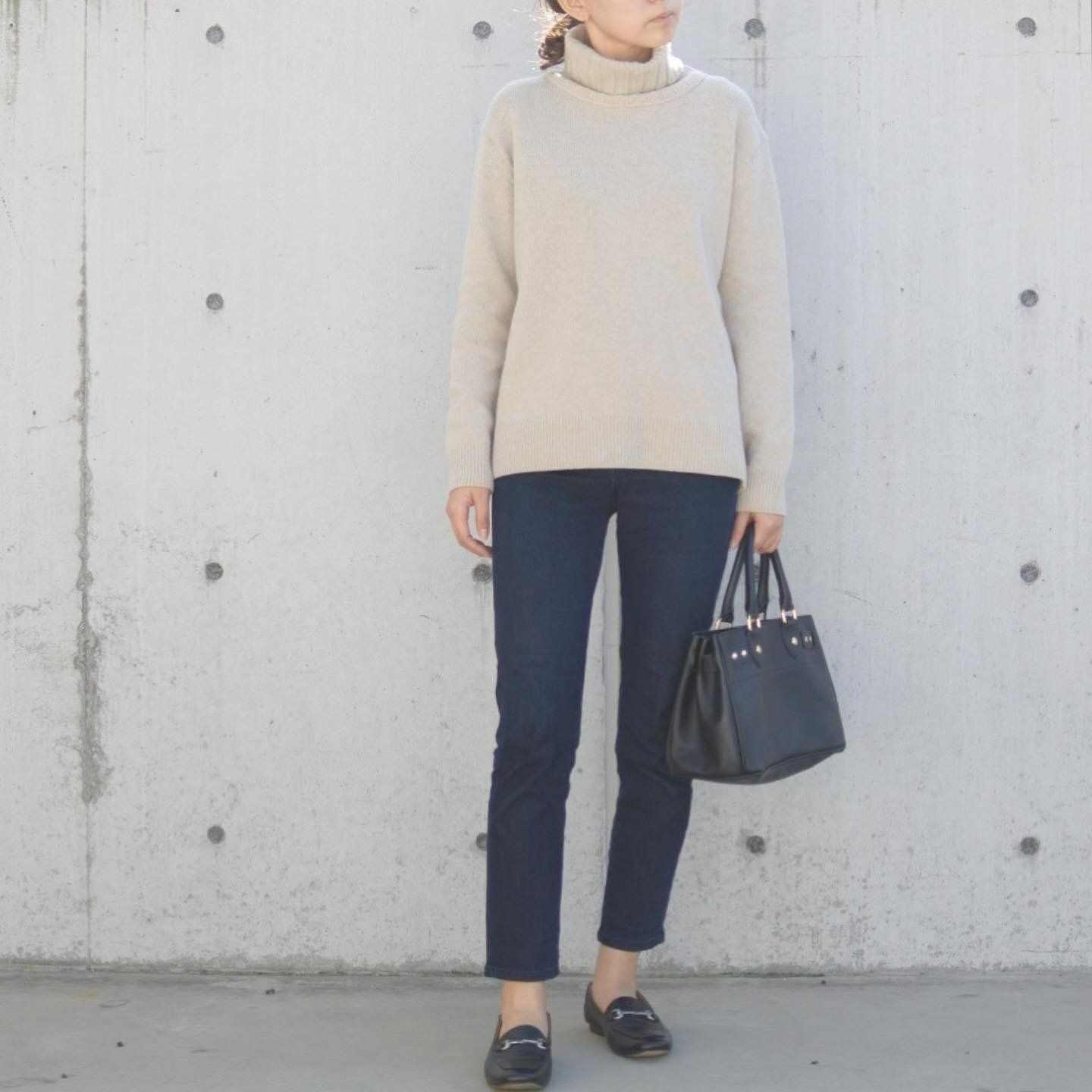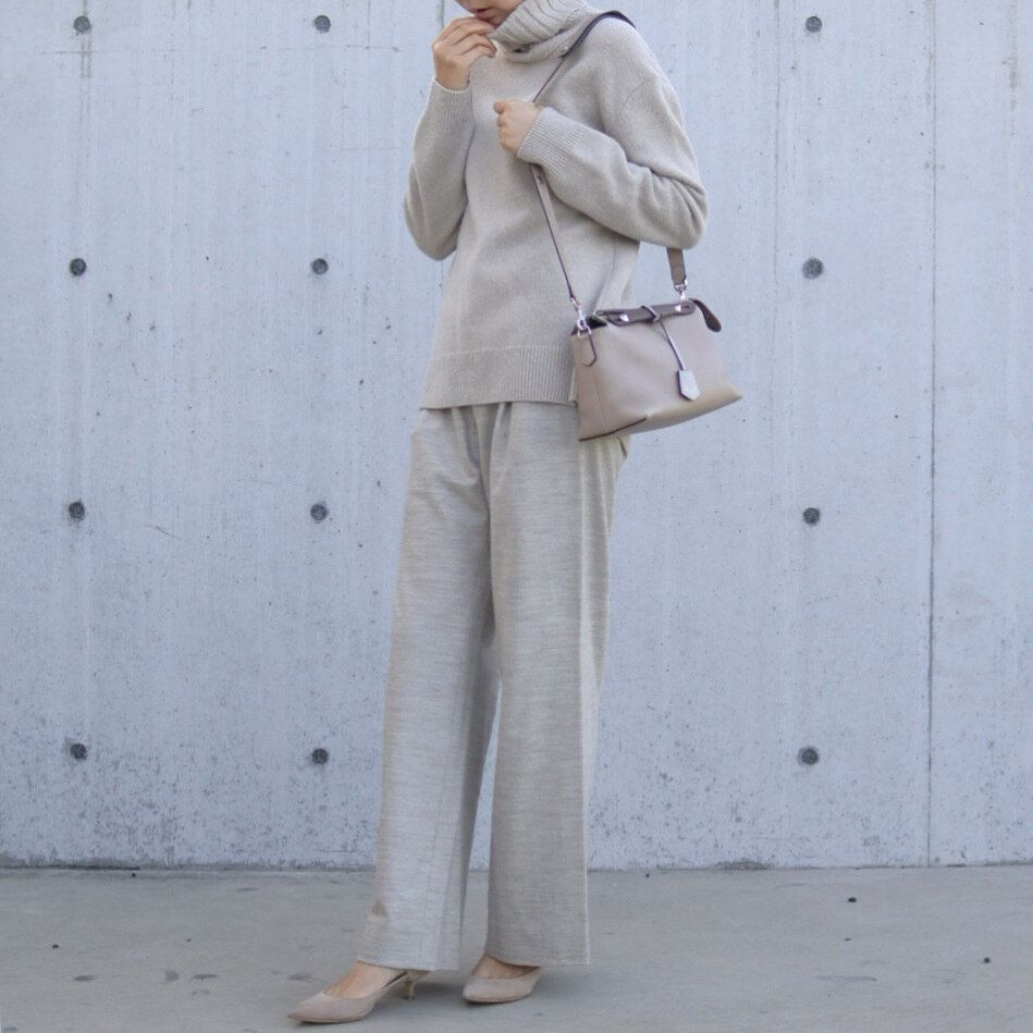 トップスはNGコーデと同じベージュのニット。ボトムや小物を同じトーンのベージュに変更してみました。一気にまとまった感じがしませんか?