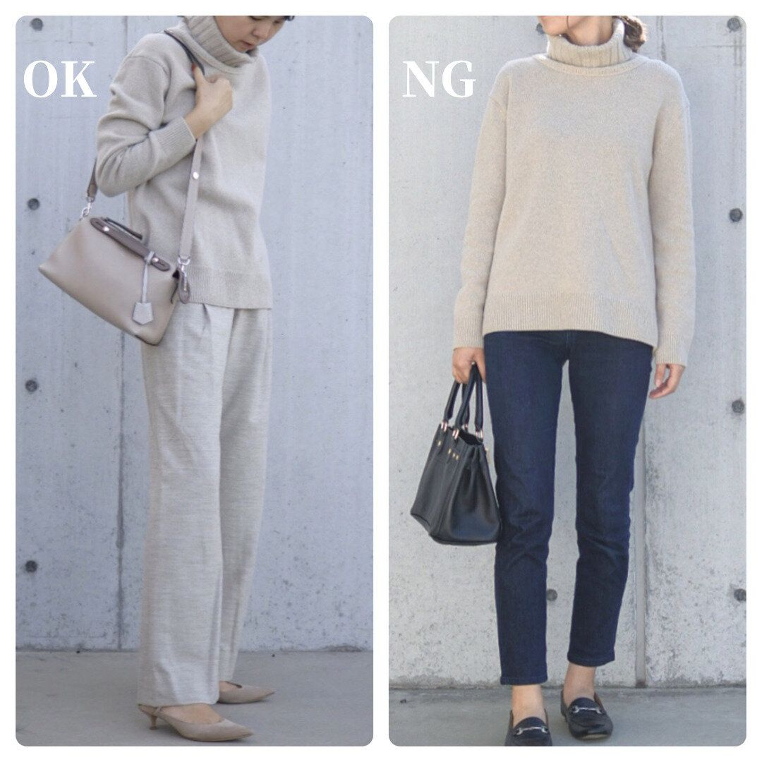 左のコーデが断然まとまってみえませんか?右のコーデのばらばら感が比べてみるとさらに目立ちます。靴、バッグの重要性がわかりますね。