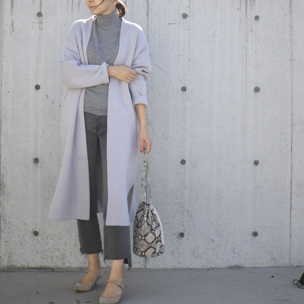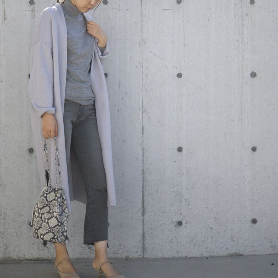 ポイントにGUのラベンダーのカーディガンとパイソン柄のバッグを。ここでもポイントは同じトーンでそろえること。