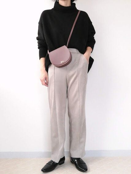 モノトーンのパンツスタイルにも違和感なく馴染みます。ななめ掛けすることで、カジュアルさも加わり若々しい印象に。