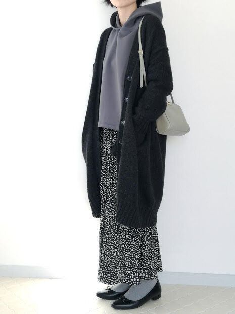 ロングスカート×ロングカーディガンでゆるっとしたスタイリングに。フェミニンなコーデに、パーカーのフードがほどよいカジュアル感をプラスしてくれます。