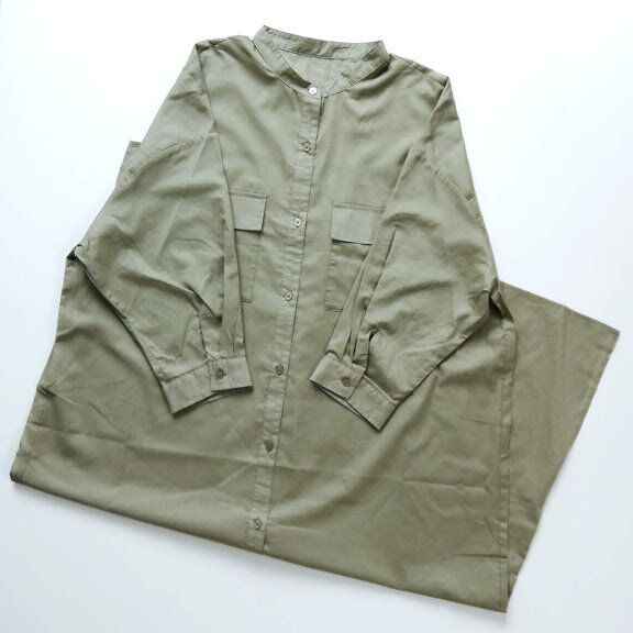ほどよい透け感とバンドカラーで、トレンドライクな着こなしが完成します。