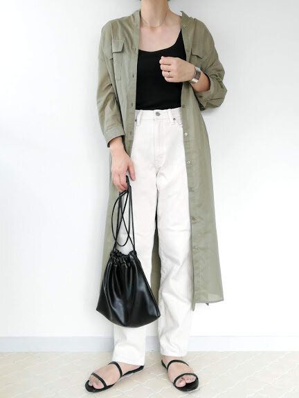 タンクトップ×ホワイトデニムに羽織ればモノトーン×カーキで、カジュアルコーデを洗練された印象に。シルバーのネックレスとバングルで大人らしさをプラス。