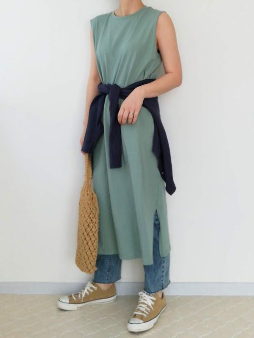 夏は1枚でアクティブに着こなすのも◎。デニムと合わせた涼しげな寒色系コーデで、爽やかさアップ!カーディガンを腰巻きすれば、気になるお腹まわりさりげなくカバーできます。