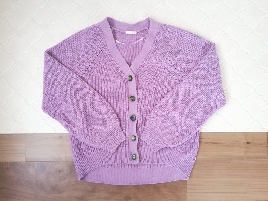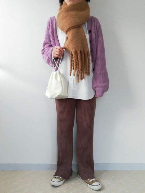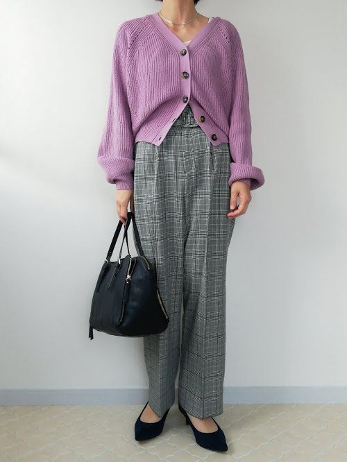 カーディガンをチェンジしただけで、ぐっと柔らかい印象に。優しい「パープル」と、丸みのあるシルエットが女性らしさを引き立ててくれます。