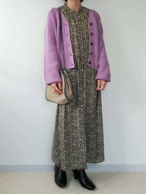 黒多めの小花柄ワンピースは、時として地味だったり、おばさんぽく見えてしまう危険も。「パープル」で明るさを足して、華やかな「脱・オバ見え」コーデに!
