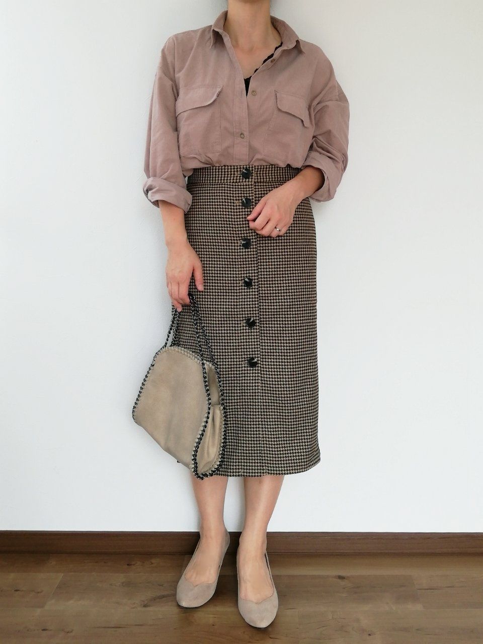 トレンドのオーバーサイズシャツを、トップスインしてきれいめな印象に。ベージュでまとめて、やわらかく今っぽい着こなしに。フロントボタンがぱっと目を引き、地味になりすぎないONコーデが叶います。