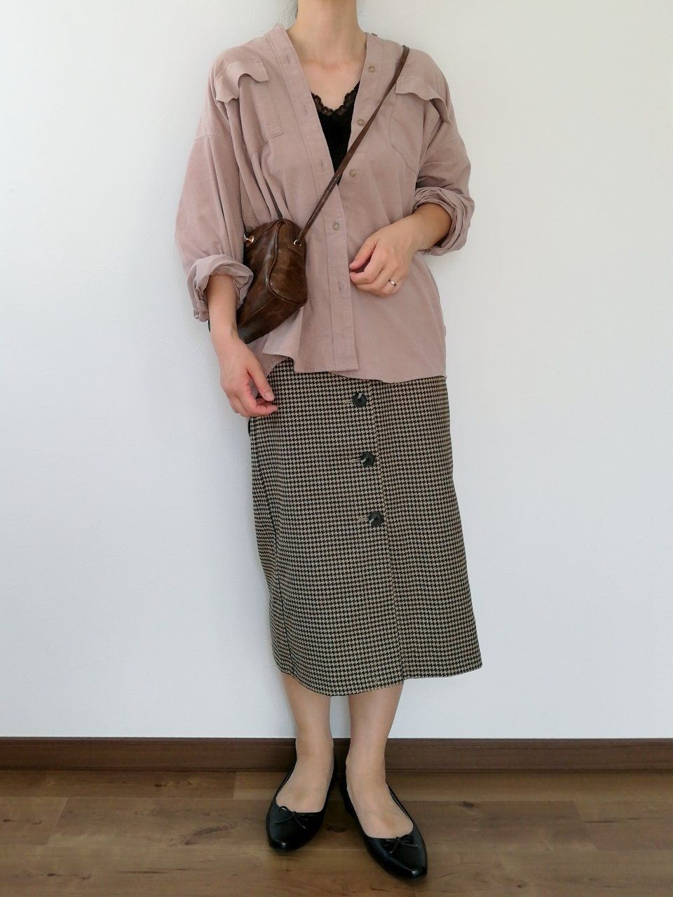 インせずそのまま着るとカジュアルな印象に。えり抜きでトレンドライクな着こなしがおすすめ。ぺたんこバレエシューズとショルダーバッグで、ほどよく力の抜けた大人カジュアルに仕上げました。