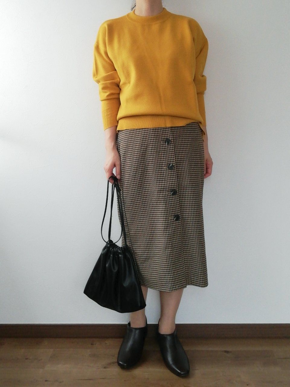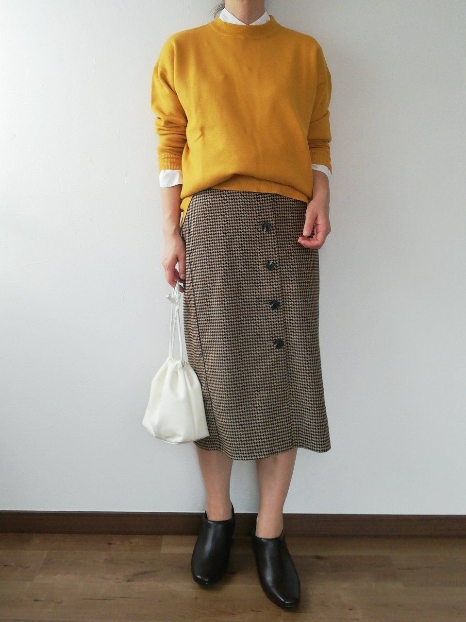 秋らしさを演出してくれる、マスタードのカラーニット。そのまま着てもシンプルで悪くないのですが、もっとおしゃれ度は上げられます!