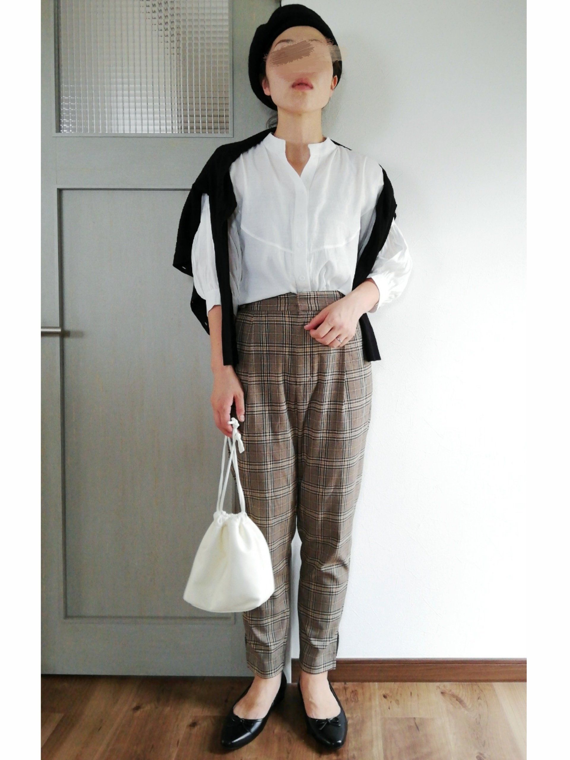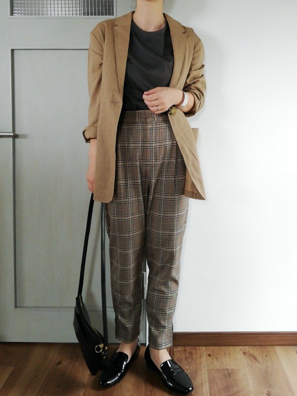 ブラウン系のチェックパンツに、ベージュのジャケットが柔らかい印象。黒のローファーとバッグで、コーデを引き締めました。