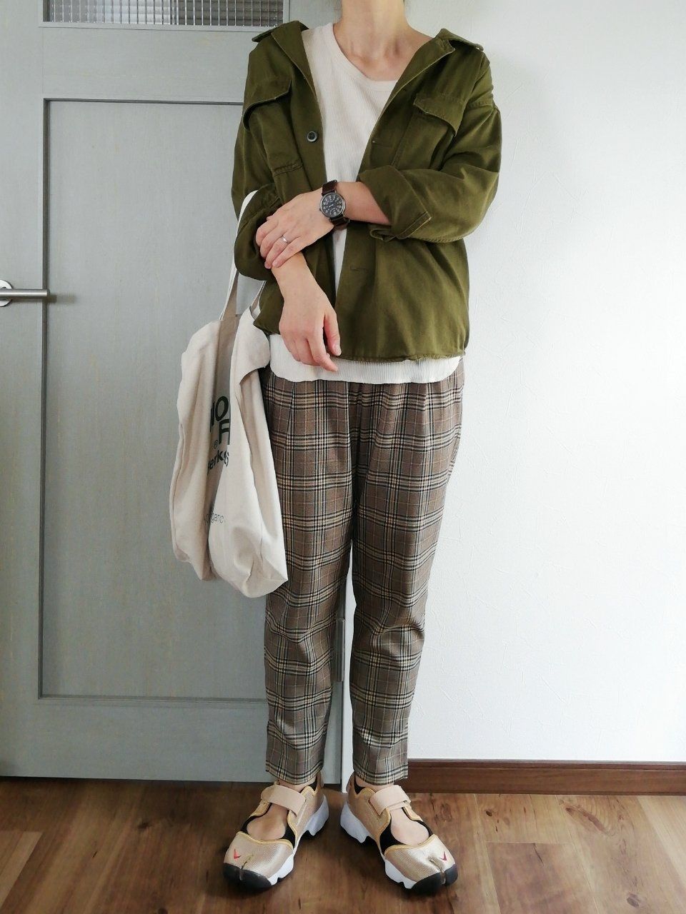 ミリタリージャケットを合わせた、カジュアルな着こなし。ブラウン系のチェック柄と、ミリタリージャケットのグリーンで、アースカラーでまとめた旬な大人カジュアル。