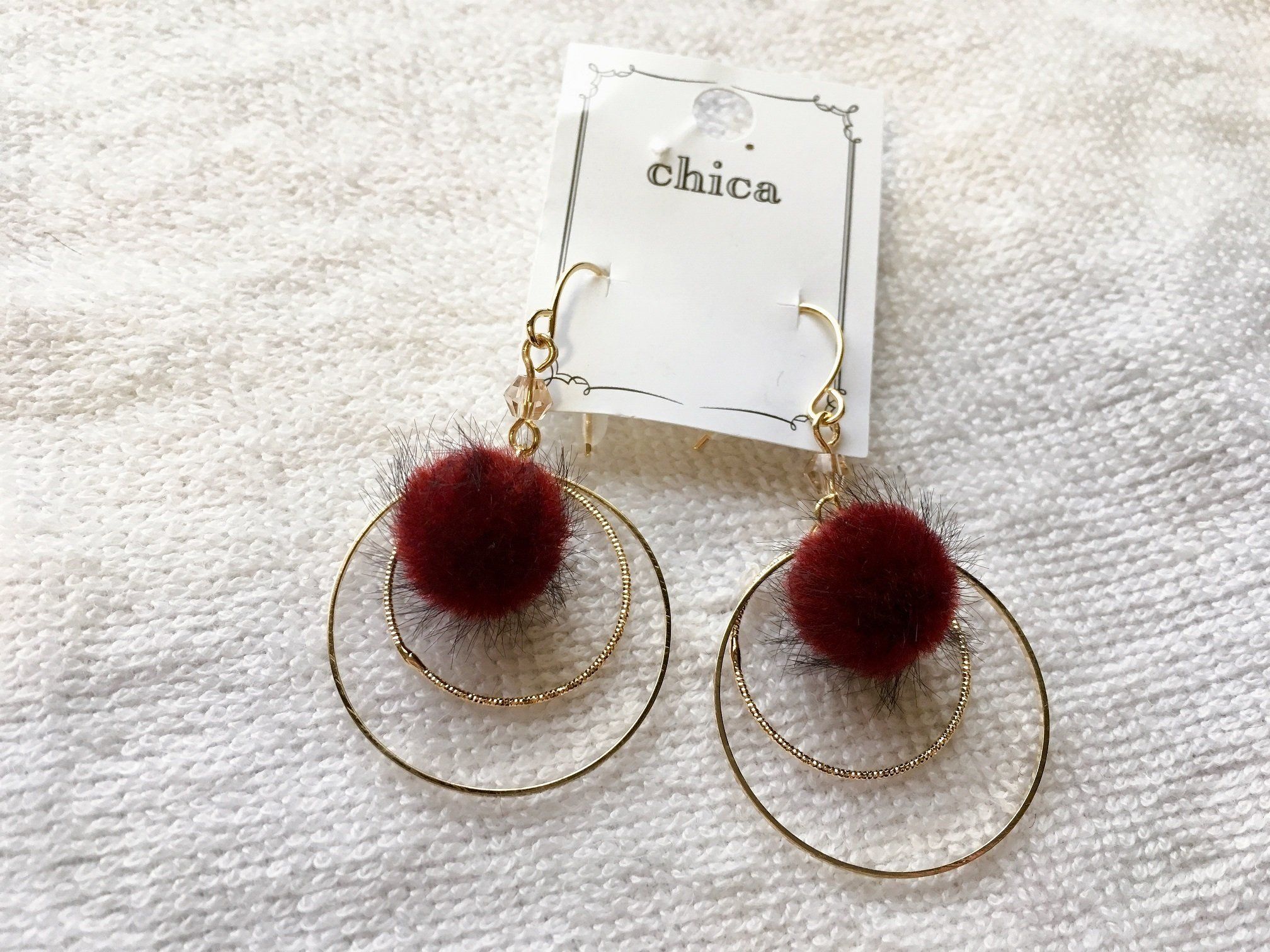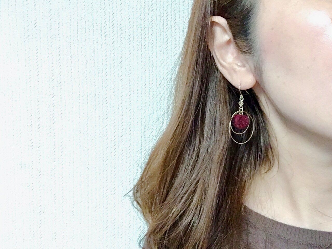 最後にご紹介するのはファー素材のピアス。ファー部分が揺れるタイプのデザインが特徴です。ファー自体は1cmほどの小さめサイズ。フェミニン系が苦手なかたでもつけやすいですよ。