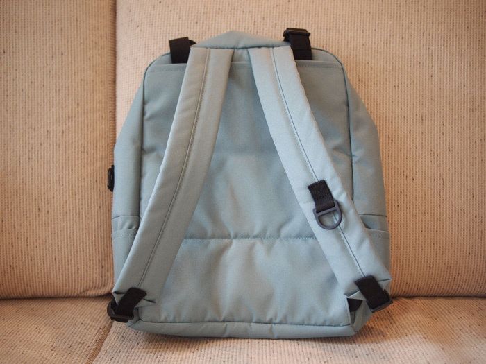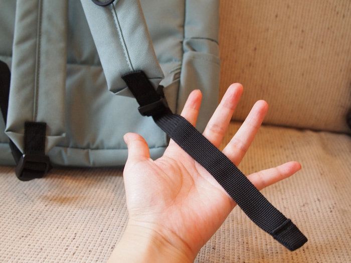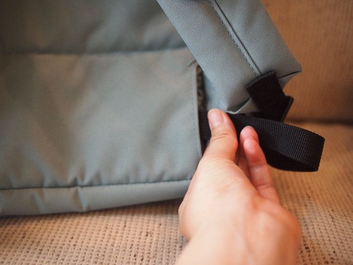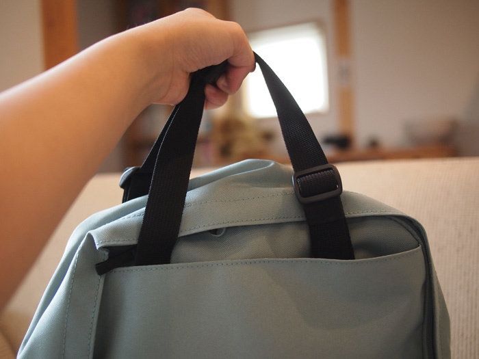 紐をしまった状態の写真がこちら。まるで最初からなかったかのようにピッタリ収まってくれています。手提げとしても使えるリュックサックということなので、持ち手の部分も調整が可能で、子どもが持つパターン、大人が手提げとして持つパターン、大人が肩かけカバンとして使うパターンなど、臨機応変に姿を変えていきます!