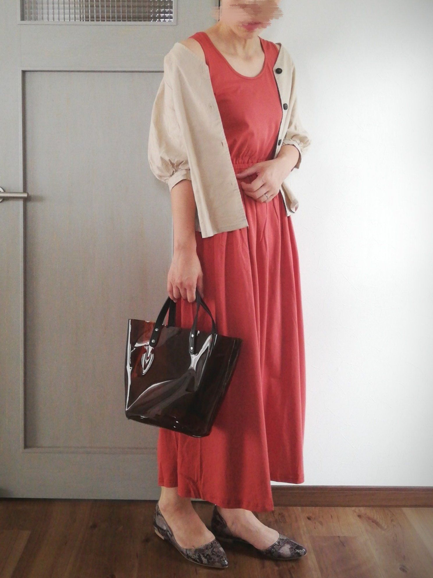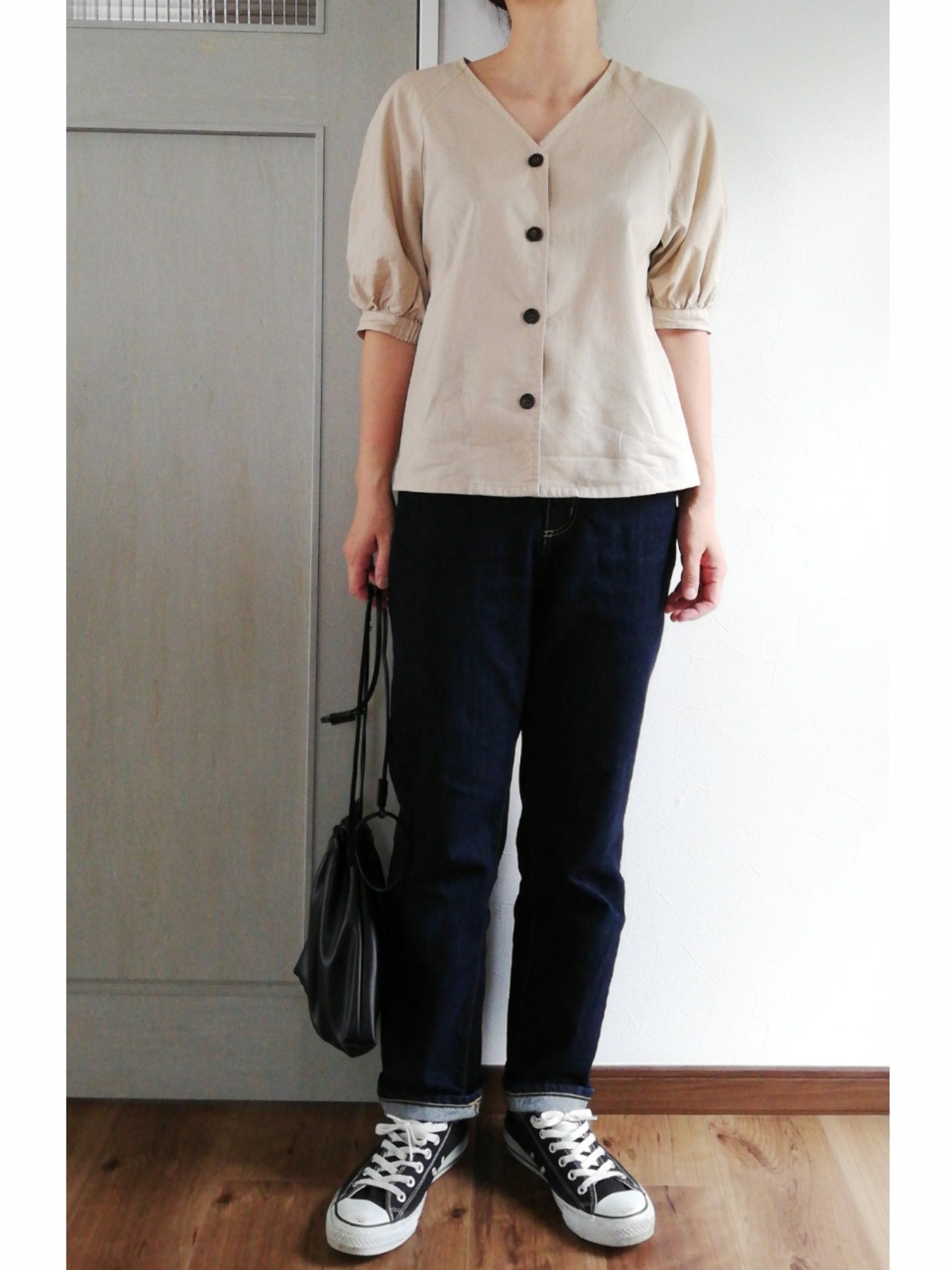 ボタンをとめて、すとんと着るとこんな感じに。悪くはないのですが、なんだかのっぺりしてあか抜けない印象に…。