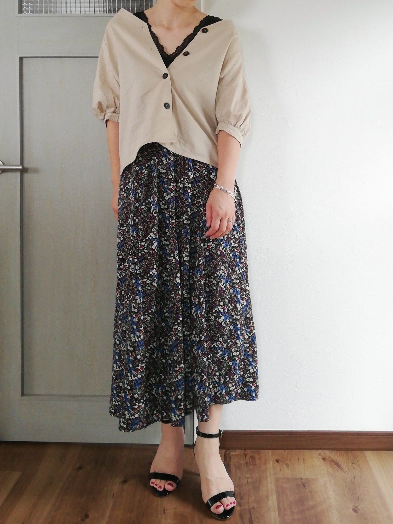 若づくりになりすぎないよう、きれいめヒールサンダルや、トーンをおさえた花柄のロングスカートでしっとりまとめるのがポイントです。