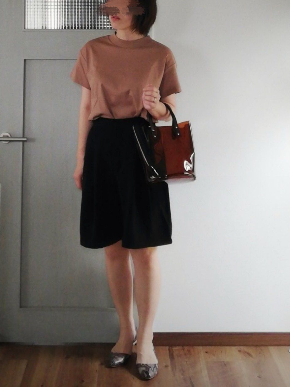 モノトーンの柄スカートに合わせて、落ち着いた印象のきれいめな着こなしに仕上げました。