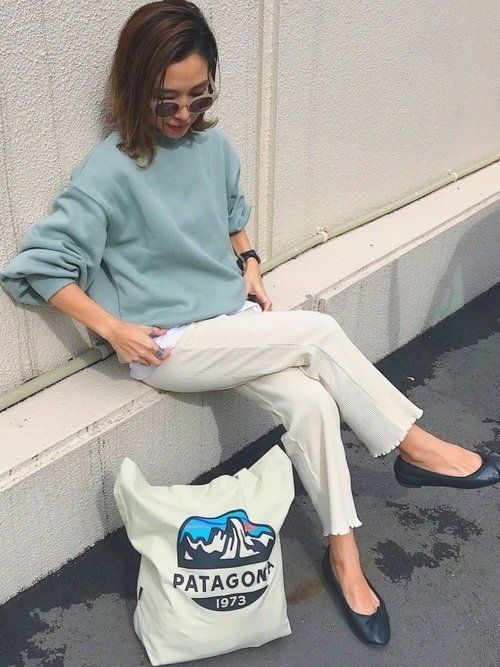 他ではあまり見ないスモーキーなグリーンが印象的なGUのスウェット。トレンドのリブパンツ、白と合わせてクリーンなカジュアルコーデに。バレエシューズで大人上品な足元が完成!バレエシューズはLa Tenaceのもの。