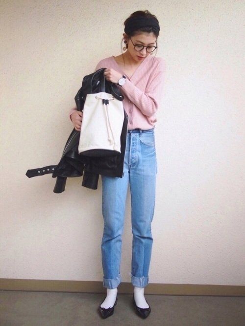 くすみピンクでデニムを女っぽく