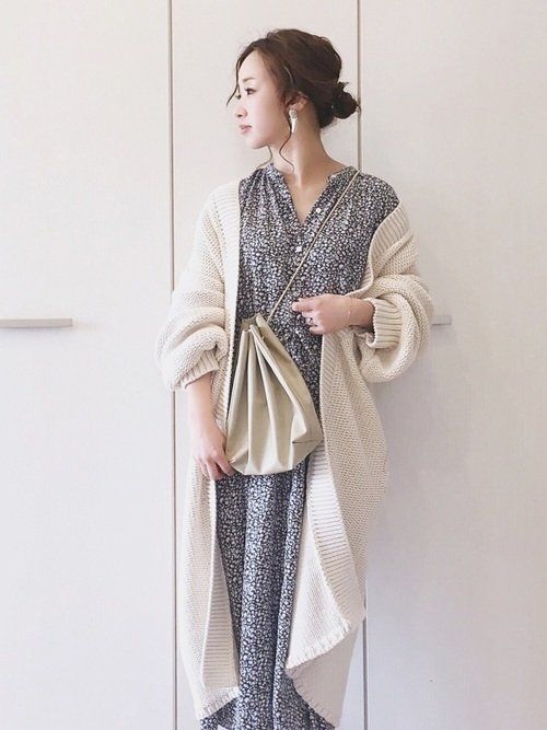 GUの花柄ワンピースの春コーデ。ダークトーンの小花柄なら大人世代にもしっくり馴染みます。今っぽいシルエットのロングカーディガンを合わせて大人可愛い着こなしに。バッグはTODAYFULのもの。