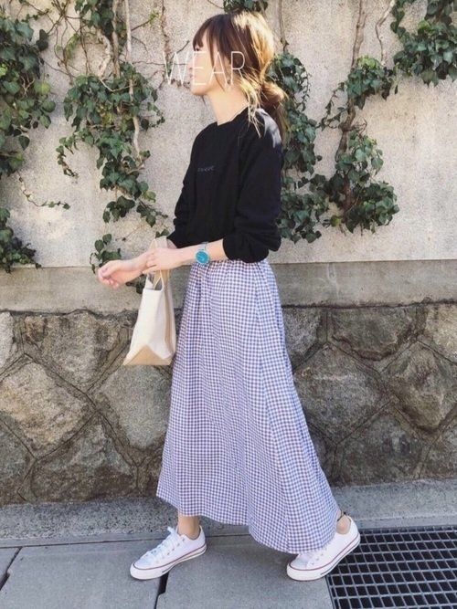 GUのギンガムチェックフレアロングスカートの着こなし。細かいギンガムチェックときれいなシルエットのロングスカートは大人女子におすすめ!シンプルなロゴTと白スニーカーでこなれ感あるカジュアル春コーデの完成!ロゴTはw closetのもの。