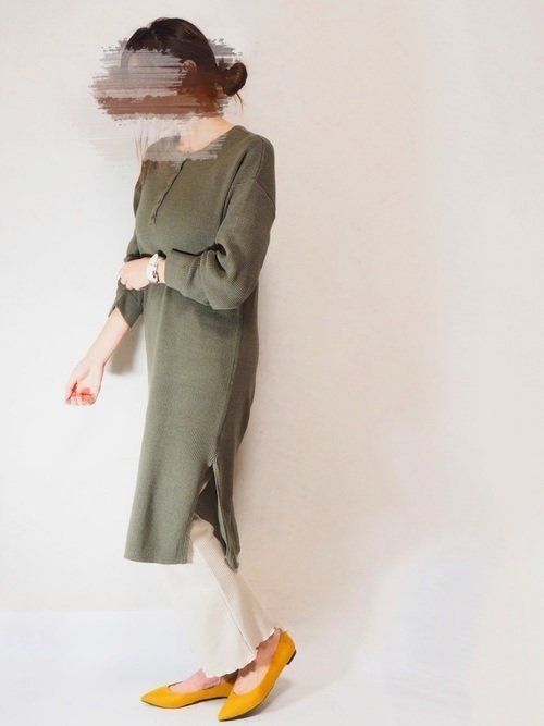 GUのポインテッドフラットシューズのコーデ。トレンドのイエローカラーもプチプラが嬉しいGUの靴ならトライしやすい!アースカラーのワッフルワンピース×白のリブパンツコーデにイエローが映える大人カジュアルコーデ。ワンピース・パンツともにしまむらのもの。