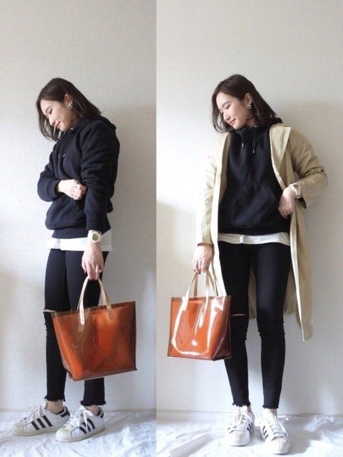 GUのクリアトートバッグを使ったコーデ。旬なクリアバッグは、明るめブラウンを選べば使いやすく合わせやすいので◎。パーカー×ダメージデニムのメンズライクなコーデに大人ムードをちょい足しできるおすすめバッグです。パーカーもGUのもの。