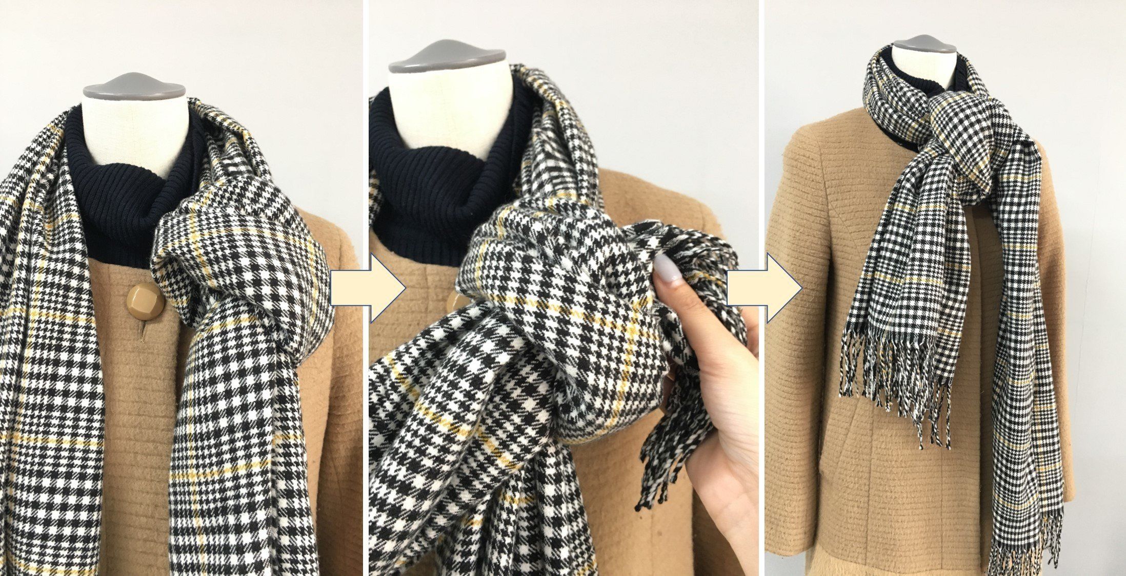 手順は簡単!首にかけたストールのうち片方を結んで、そこにもう片方を通すだけ。この時ポイントは左右の長さのバランスを変えることです。長いほうが前に来るように結び目をサイドに寄せたら完成です!ウールコートに合うすっきりアレンジの出来上がりです。
