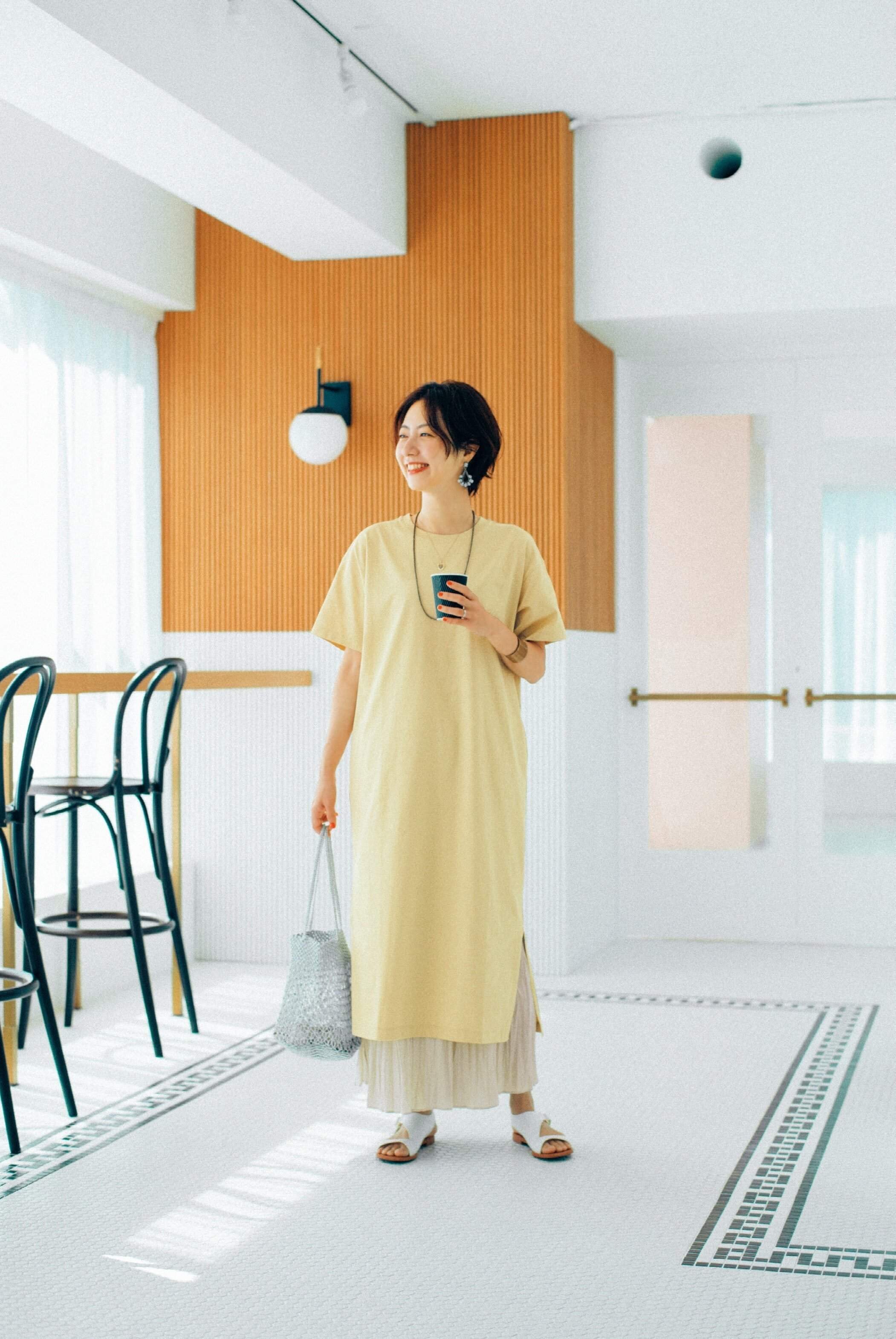 「大人は特に形に気をつけて。単純な”T”の形ではなく、トレンドのビッグシルエットやフレンチスリーブなど、デザイン性が高い物を選びましょう。このTシャツワンピは光沢感のある素材も好印象だし、すそにスリットが入っているから、重ね着しても軽やか。まさに40代に似合うTシャツと言えますね!」。