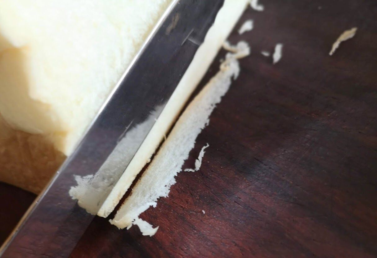 まずは食パンの外側耳部分は少し硬いので波刃で入りのきっかけを作ります。