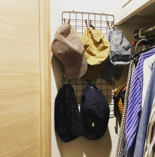 こちらはクローゼット内に縦長のワイヤーネットを取りつけて、帽子やマスクなどをかけている例です。とてもみやすく取り出しやすいですね。クローゼット内のスペースを有効活用できるよいアイデアです。
