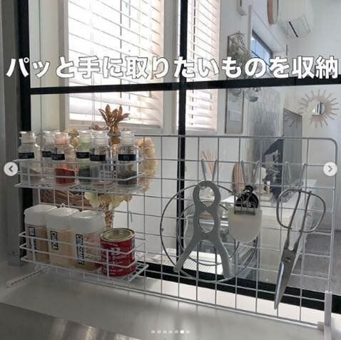 調理中にパッと手が届く場所に、こんな素敵な収納スペースがあれば便利ですよね。これは、セリアで買えるワイヤーネット用のスタンドを使ったアイデア。ワイヤーネットを壁に取りつける必要がないので、賃貸のお部屋のかたにもおすすめです。同じくワイヤーのカゴを使って調味料を収納したり、さっと使いたいハサミなどのキッチンツールがかかっていたりと、使い勝手もよさそう!