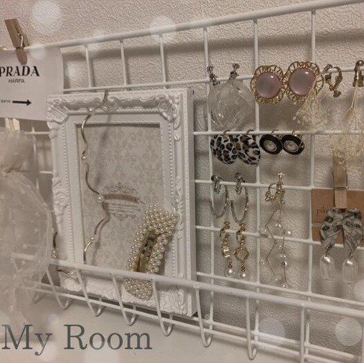 こちらは100均のワイヤーネットを使ってアクセサリーを収納している例です。イヤリングやヘアアクセサリーがとてもおしゃれに、きれいに収納されていますね。