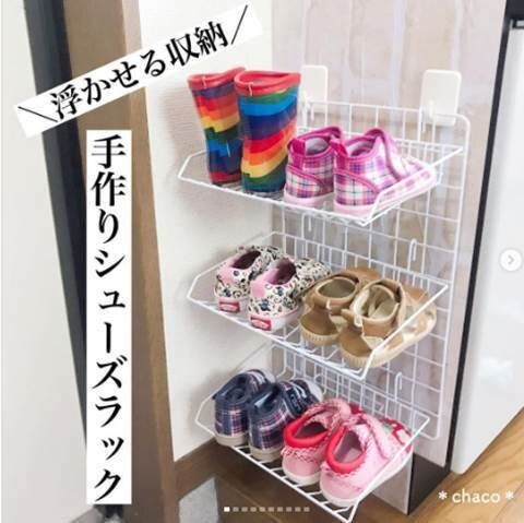 シューズラックをセリアのワイヤーネットと、ワイヤートレーを使ってつくったアイデアです。賃貸のお部屋などは靴箱がたりない、あるいはまったくないなんてことも!シューズラックも買えば結構なお値段ですが、ワイヤーネットでつくれば、リーズナブルに、しかもぴったりのサイズでつくることができます。玄関のお掃除も楽チンですね。シューズラックをつくってしまうなんてすごい!