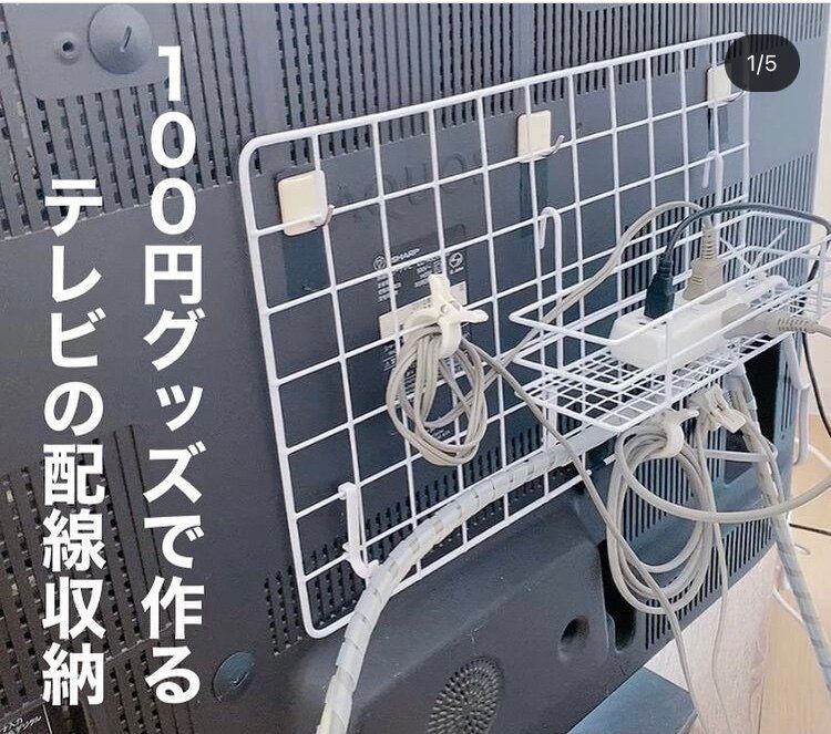 こちらは、じつは100円ショップのワイヤーグッズを組み合わせてつくった配線収納なんです。ごちゃごちゃして埃が溜まりがちな配線もこれでスッキリ…配線の量やテレビの大きさでカスタマイズ可能なのがうれしいですね。