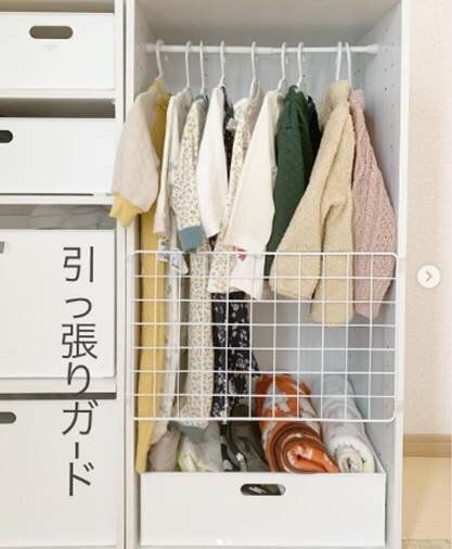 カラーボックスでつくったかわいいベビー収納。でも、赤ちゃんにとってはかっこうの遊びアイテムでした。お洋服を引っ張って落としてしまうので、ママは困っていたそうです。そんなときにもワイヤーネットが使える!ガードとしてワイヤーネットをひもで結んだアイデアです。これでもう安心ですね。